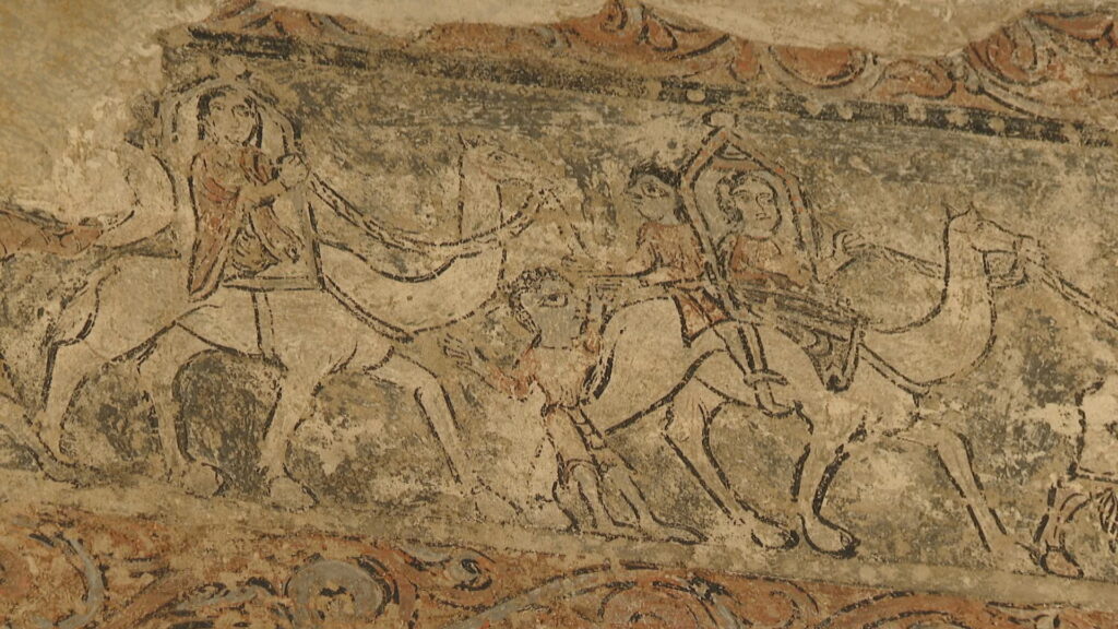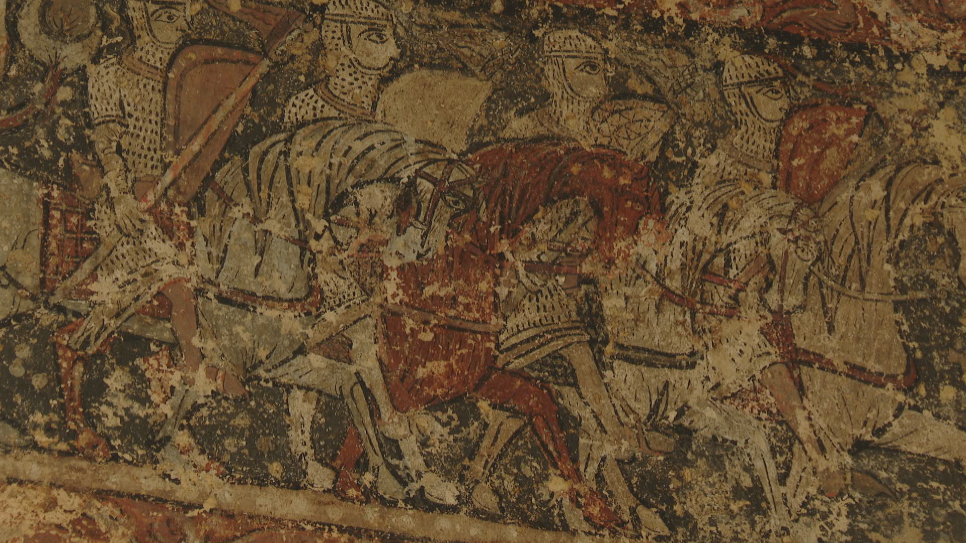 Les pintures, presentades en vuit plafons de dimensions diverses, daten del segle XIII i formen un fris continu que fa 110×2.253,9×4 cm. Es tracta de fresc traspassat a tela i muntat sobre un suport de fusta i guix als anys 60 del segle XX. El conjunt decorava la part superior dels murs d’una sala rectangular situada entre l’església i el claustre del monestir de Santa Maria de Sixena (Vilanova de Sixena, Osca) i en aquest cas no van estar afectades per l’incendi del monestir.