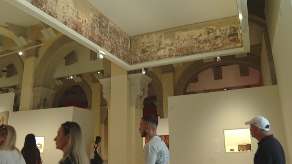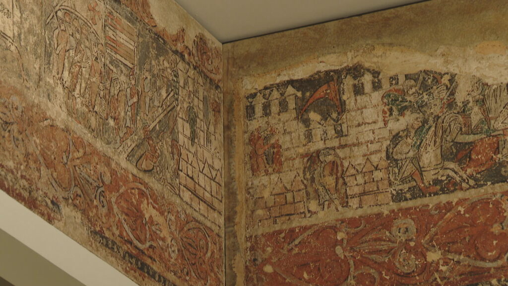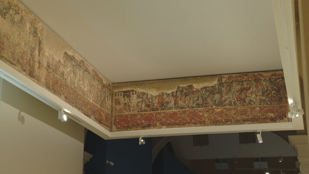 Mentre que les pintures de la sala capitular es mostren a l’última sala del romànic, la 16, les Pintures profanes es poden visitar a la primera sala del gòtic del MNAC, just a l’entrada. L’atracció de les pintures del fons de la sala, però, eclipsa el fris, que passa desapercebut per la majoria de visitants.