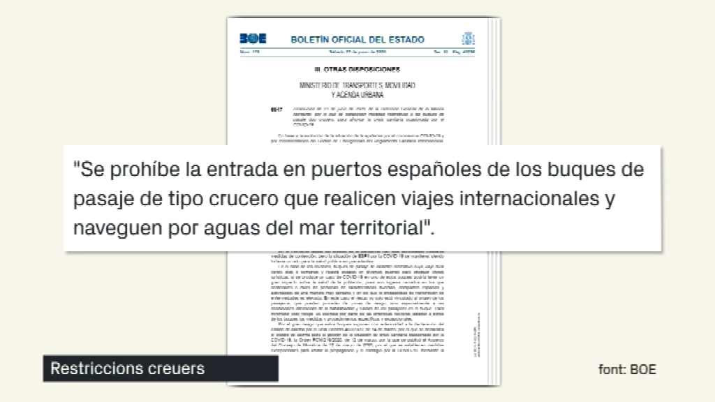 La restricció va fer-se efectiva al març i havia d’acabar amb el final de l’estat de l’alarma, però el Govern espanyol va decidir mantenir aquesta prohibició perquè considera que “la naturalesa imprevisible i dinàmica del virus desaconsella reprendre l’activitat creuerística”. Ho recull el Butlletí Oficial de l’Estat, que afegeix que si es produís un cas de covid-19 en un vaixell “tindria un gran impacte sobre la salut de la població”. El sector, però, critica la mesura.
