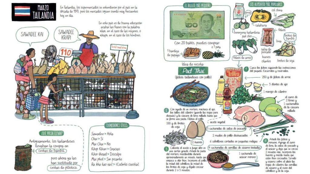 La volta al món il·lustrada fa parada a l’estat espanyol, on destaquen com a aliments més populars l’albergínia, el carbassó, els ous, les carxofes, l’all, l’oli d’oliva, les patates, l’arròs, la carn de porc, el pollastre, els cigrons, la mongeta verda, el peix i el marisc. No només apunta els ingredients tradicionals, sinó que també ressalta altres elements vinculats a la nostra gastronomia, com els carrets de la compra. Un estri que sorprèn l’autora fins al punt que escriu: “Són tan populars que els supermercats tenen una zona reservada per aparcar-los”.