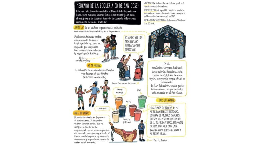 El capítol dedicat a Espanya arriba fins a la Rambla i s’atura a la Boqueria, un dels mercats més visitats del món. “Quan jo era petita no hi havia tants turistes”, comenten dues veïnes del barri a les pàgines del llibre. L’autora no ha arribat a temps d’incloure el trasllat del mític Pinotxo al mercat de Sant Antoni i encara el recomana com una parada indispensable de la Boqueria. El que sí que assenyala és l’oferta creixent de sucs de fruites.