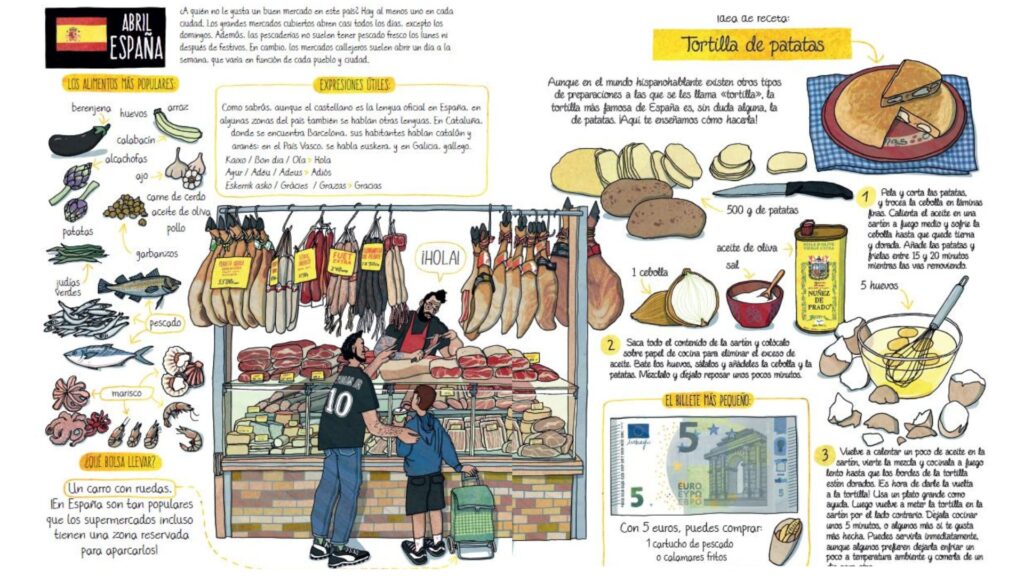 El llibre detalla que hi ha diferents llengües a l’estat i apunta algunes expressions per saludar i agrair. La il·lustració reflecteix una carnisseria on es ven xoriç ibèric, fuet extra i llonganissa de pebre. Pel que fa a la recepta, proposen la truita de patates amb ceba i expliquen tots els passos a seguir.