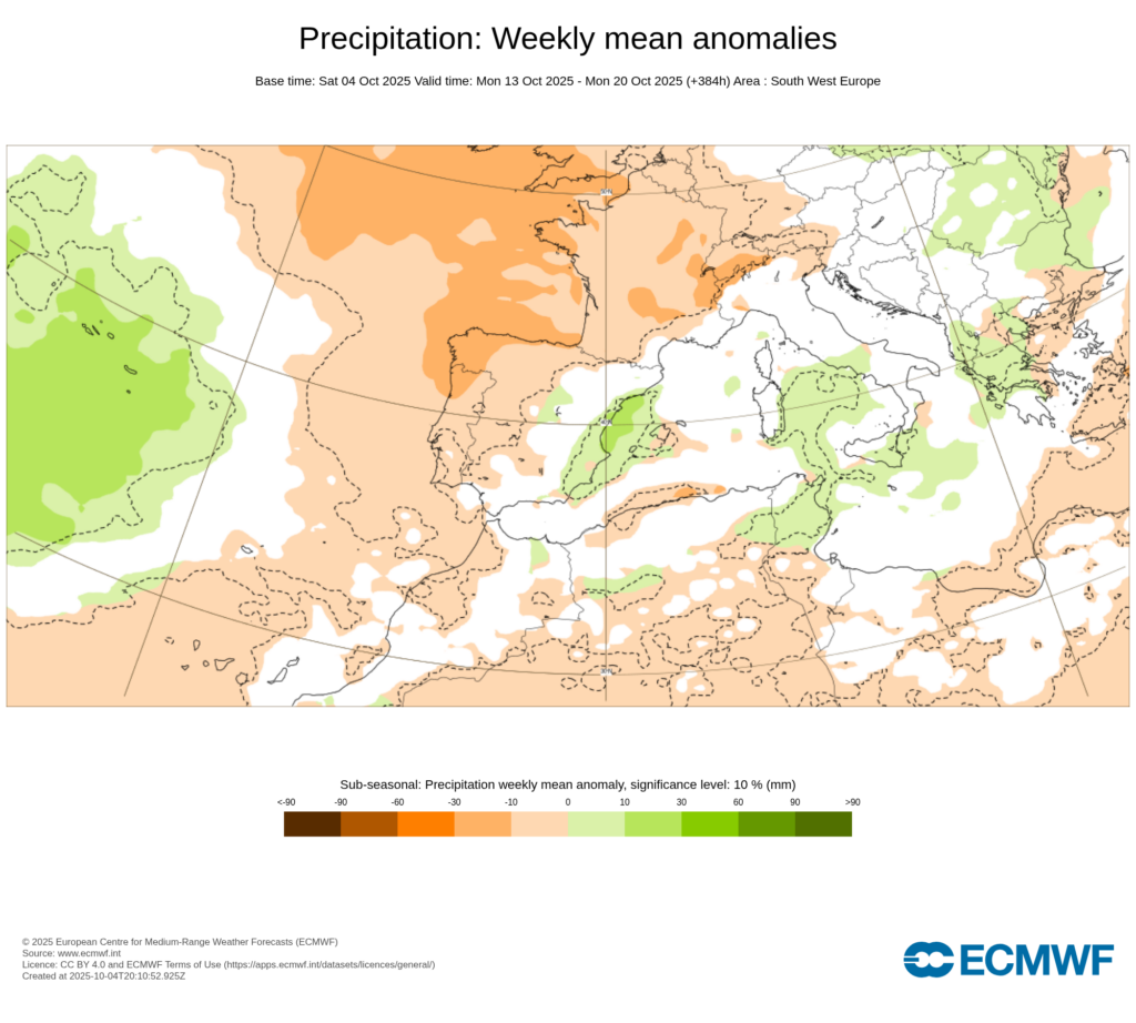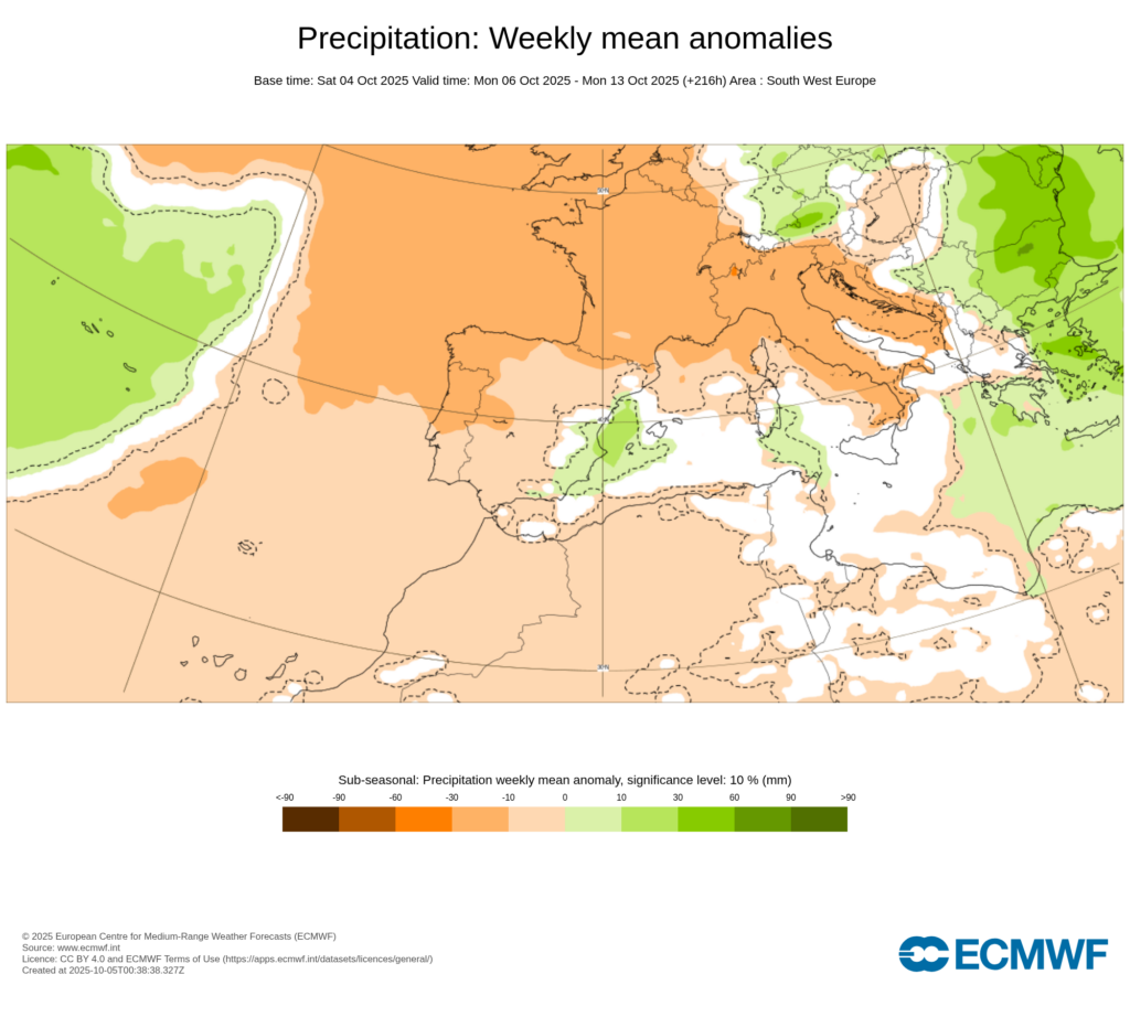 Així ho mostren el mapes d’anomalia setmanal de precipitació del model centreeuropeu (ECMWF), que pronostiquen més precipitació de l’habitual a tot el litoral mediterrani de la península Ibèrica durant les setmanes del 6 al 12 d’octubre i del 13 al 20 d’octubre.