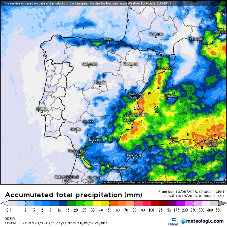 Els mapes d’acumulació fins dissabte dels dos grans models generalistes (GFS i ECMWF) divergeixen força en el pronòstic, tot i que ambdós coincideixen que la pluja podrà afectar en major mesura el País Valencià.