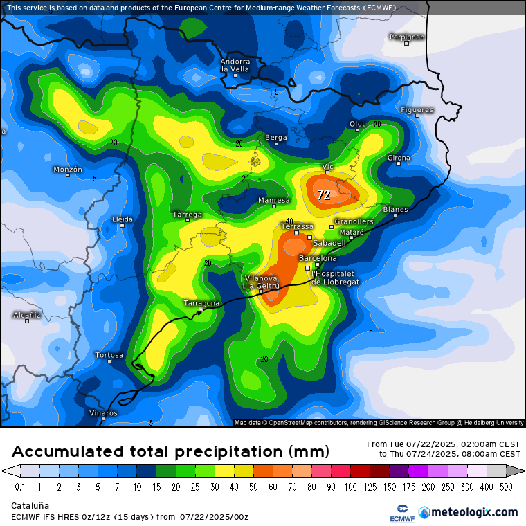 El model centreeuropeu (ECMWF) és una mica menys generós, però també manté la màxima acumulació de precipitació fins dijous al matí en punts del nord-est de Catalunya, i del prelitoral i el litoral central i sud.