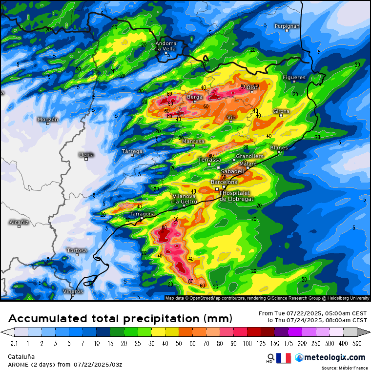 El model AROME pronostica registres que podrien assolir els 100 litres en punts propers al Port del Comte, el Cadí o la carena del Puigmal i l’Alt Ripollès fins dijous a primera hora del dia. També apunta a valors notables de precipitació en punts del litoral i el prelitoral, en alguns casos de més de 50 litres per metre quadrat.