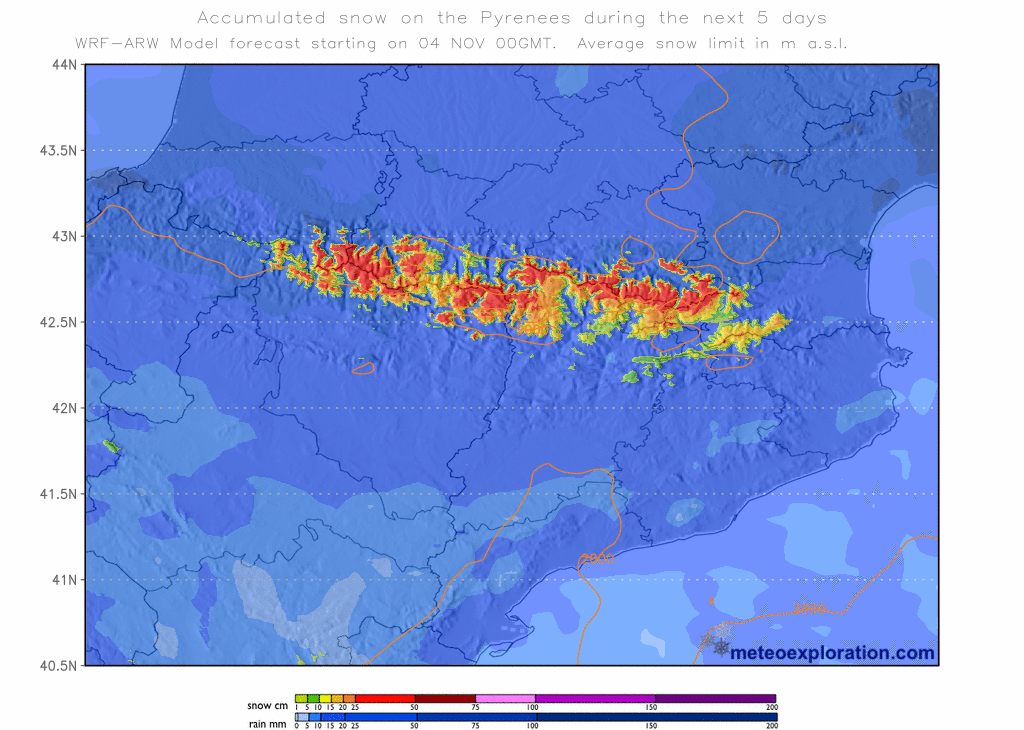 El front també deixarà una mica de neu als Pirineus, però a cotes elevades. El gruix de precipitació afectarà els Pirineus al llarg del matí de dijous, moment en què la cota de neu pujarà cap a 2.000-2.200 m aproximadament. La cota davallarà cap als 1.800 m entre la tarda i el vespre, tot i que la nevada es concentrarà sobretot prop de la cara nord dels Pirineus. Els xàfecs del vessant sud i dels Prepirineus s’entreveuen més irregulars i dispersos dijous a al tarda.