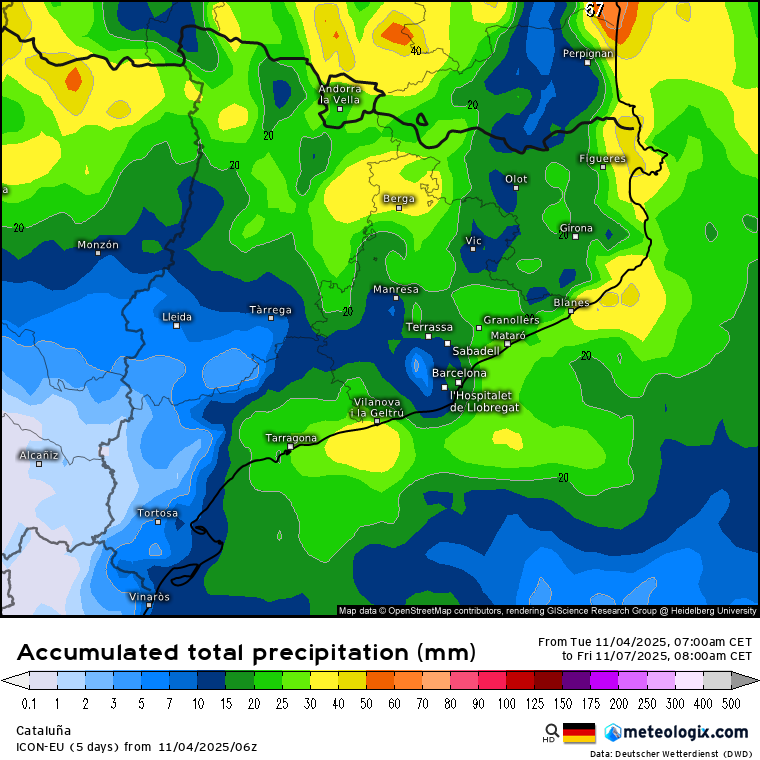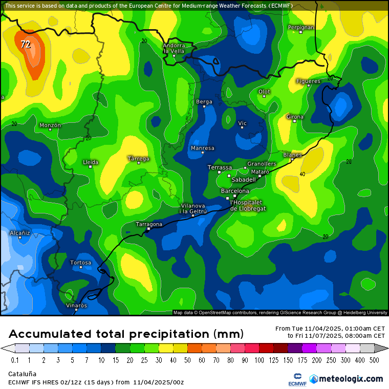 Els models generalistes, com ECMWF i ICON, destaquen valors de precipitació acumulada fins divendres al matí entorn dels 20 litres en el cas de Barcelona.