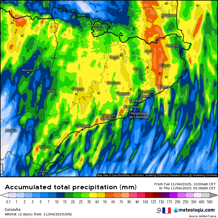 Caldrà estar atents a les sortides dels models d’escala reduïda com l’AROME, que a hores d’ara parla de registres notables fins dijous al migdia, superiors a 20 o 25 litres en el cas de Barcelona, però de més de 40 litres en alguns punts de la meitat sud del litoral i del prelitoral central.