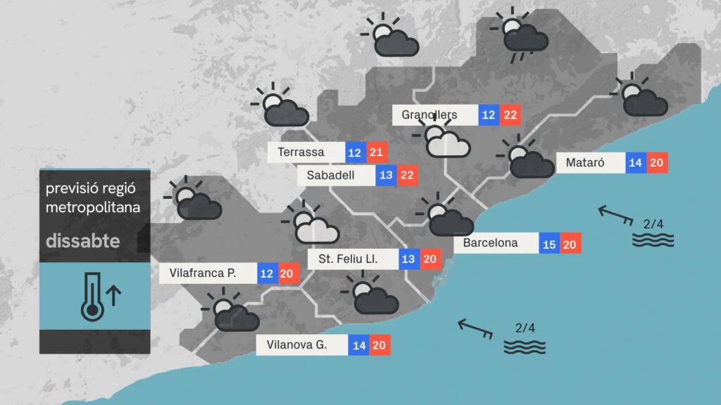 Dissabte de cel canviant. Força núvols fins a mig matí i possibilitat d’alguna gotellada o xàfec curt. Estones de sol al centre del dia i augment dels núvols altre cop de cara a la tarda. No es descarta algun xàfec local cap al Montseny entre la tarda i el vespre.