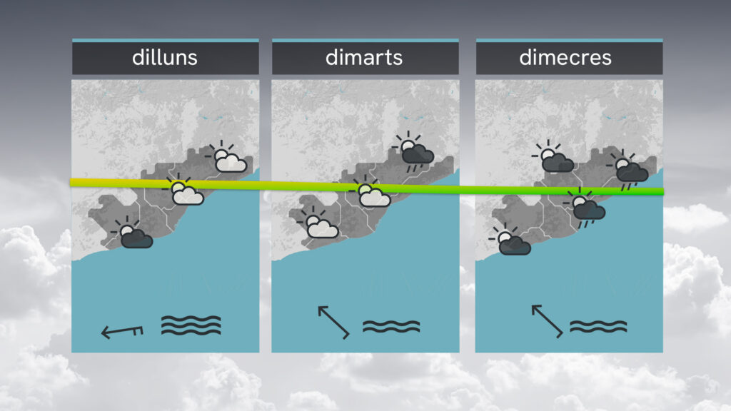 Dilluns s’obriran clarianes de manera gradual al llarg del dia, les precipitacions s’allunyaran cap al sud de Catalunya. Dimarts serà variable amb algun xàfec de tarda prop del Montseny, i dimecres més inestable amb ruixats freqüents a la costa barcelonina.
