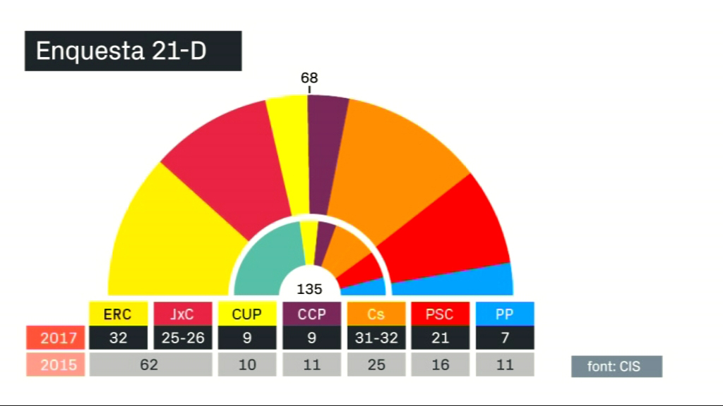 ERC, Junts per Catalunya i la CUP sumarien 67 diputats i es quedarien a un escó de la majoria absoluta. Tot i que en diputats guanyaria Esquerra, segons l’enquesta, Ciutadans s’enduria la majoria de vots, amb un 22,5 %.