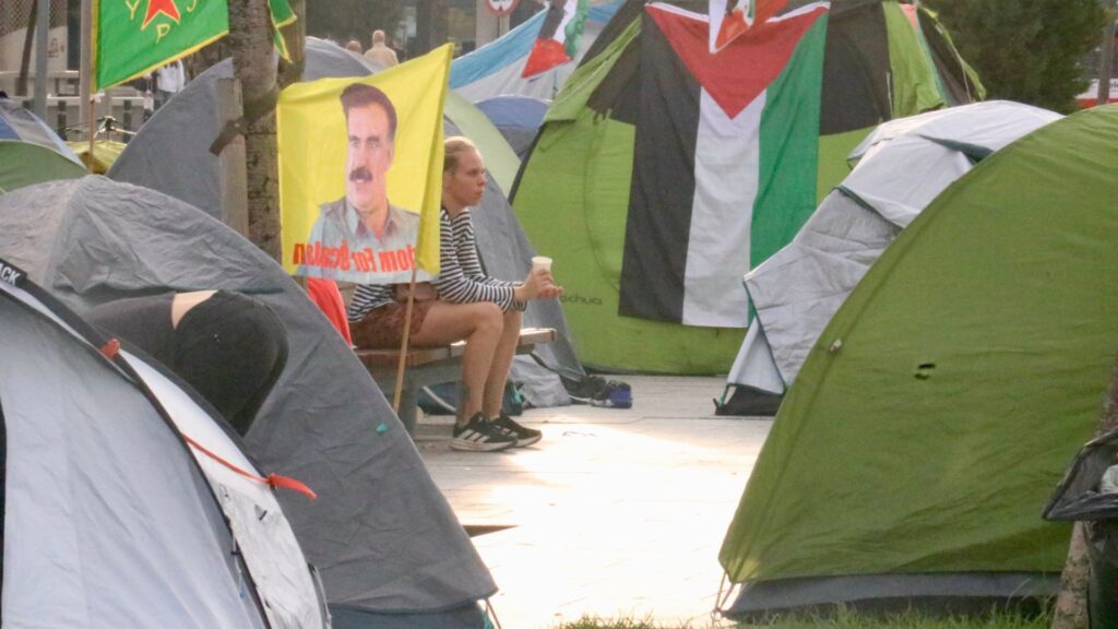 El dia ha arrencat aviat al campament i des de les 8 h s’han posat en marxa els més matiners. Les primeres cafeteres fumejants amb fogonets de càmping entre tendes i raspallades de dents a tocar de la font d’aigua pública s’han barrejat amb la mirada dels turistes que han començat a arribar a la zona del port, maleta de rodes en mà, per agafar els busos que recorren la ciutat.