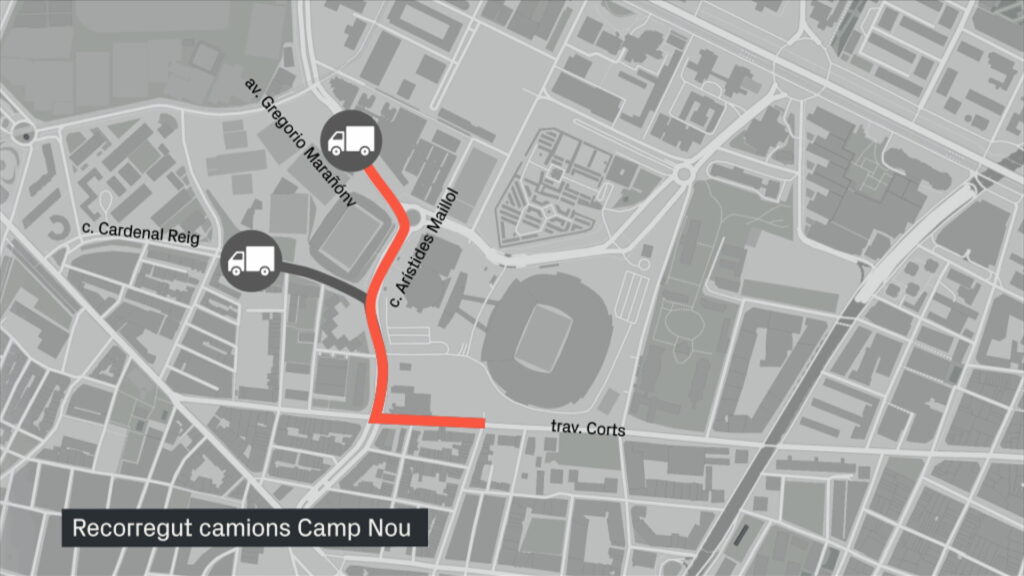 Els camions farien aquest trajecte allunyats de blocs de pisos, perquè la nova entrada a la pedrera estaria ubicada en una zona sense habitatges. A l’avinguda Gregorio Marañón hi ha terrenys del Barça i edificis universitaris.