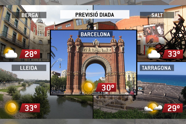 La calor s’incrementarà i diumenge els termòmetres acabaran marcant temperatures màximes un parell de graus més altes que dissabte a la majoria comarques. Les altes temperatures faran imprescindible vestir-se d’estiu i portar calçat còmode. Serà necessari dur força aigua, i també una gorra o un barret, ja que el sol encara podrà picar amb ganes fins a última hora. Aquesta és la previsió per a les localitats on es duran a terme els principals actes de la Diada: