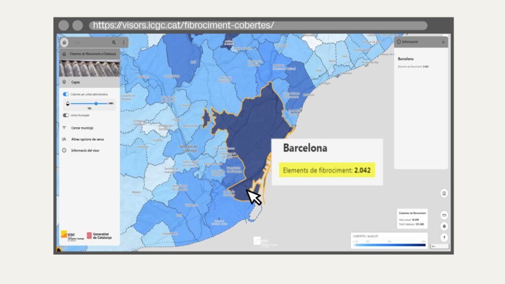 El nou visor de cobertes de fibrociment és el mapa que permetrà als municipis i a particulars de tota Catalunya saber si la seva coberta està feta amb fibrociment i, per tant, si és susceptible de contenir amiant, especialment si és anterior a l’any 2002, que és quan se’n va prohibir l’ús. En total, Barcelona té un total de 2.042 cobertes amb fibrociment distribuïdes especialment a la Zona Franca i al Bon Pastor, i un total de 17.716,01 tones d’aquest material.
